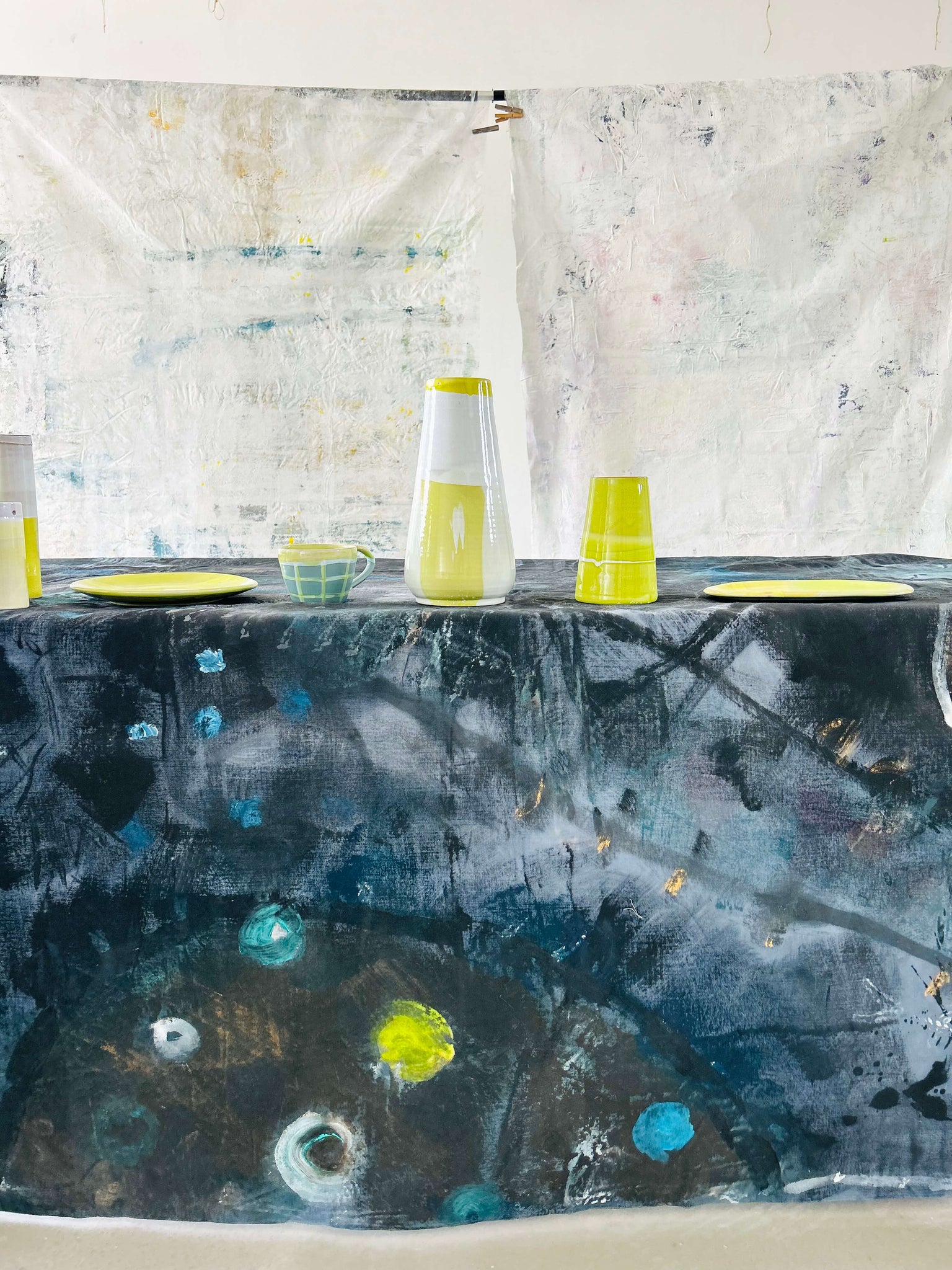 tonalités de blanc, de jaune moutarde et de jaune acidulé.